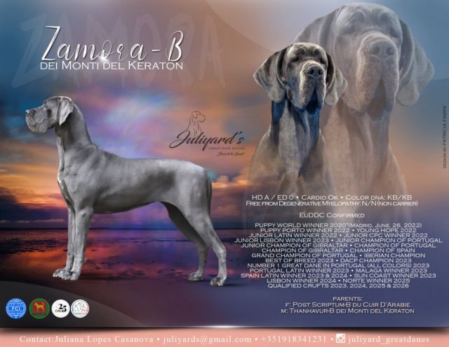 Puppy World Winner 2020 (Madrid, June 26, 2022), Puppy Porto Winner 2022, Portugal Young Hope 2022, Junior Latin Winner 2022, Junior CPC Winner 2022, Junior Lisbon Winner 2022, Latin Winner 2023 (PT ES), Malaga Winner 2023, Sun Coast Winner 2023, DACP CHAMPION, PORTUGAL BEST OF BREED 2023 (PT), TOP 1 GREAT DANE IN PORTUGAL 2023 (ALL COLORS), Lisbon Winner 2024, Latin Winner 2024 (ES), IBERIAN CHAMPION, Qualified CRUFTS 2023, 2024, 2025 and 2026, EuDDC Confirmed