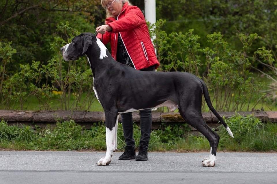 Int.CH (FCI), CH Norway ♀ NORDIC GIANTS ECHO STEPS Harlequin |