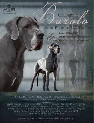 ![]() | BAROLO VOM BISMARCKWÄLDCHEN , VDH/DDC 130408 UNITY-BLUE VOM POLARSTERN x QUALITY VOM FRANKENLAND Austrian Club Winner 2023, CH Austria, CH Belgium, CH Denmark, CH Germany (DDC), ..., HD-A/A, ED-0/0, Cardio: OK | 25.06.2017 Кобель Голубой |