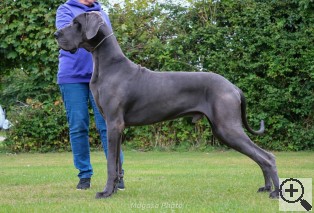 Gitte Finnich Pedersen: stor han, særdeles maskulint hoved, ganske god skalle, en anelse for markeret occiput, godt stop, godt næseparti af god styrke, må ikke have mere hængende læbe, god længde på hals, ædel manke, kunne ønske mig et kortere lændeparti, korrekt dyb bd den 11. ryghvirvel, godt forbryst, acceptabel vinkel i sin skulder, bevægelser kunne være mere effektive, dels mere drive i fronten og bedre reach, bevæger sig generelt noget ustabilt, fronten har han svært ved at styre. CACIB, 13.11.2022