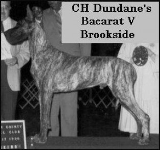 ![]() | DUNDANE'S BACARAT V BROOKSIDE, AKCSBWF552280 SHEENWATER'S ACE IN THE HOLE x BROOKSIDE'S ABBY OF DUNDANE CH USA | (†) 17.02.1984 Male Brindle |