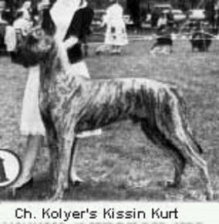 ![]() | KOLYER'S KISSIN KURT, WA80495 KOLYER'S HANK OF HOLLAND-BROOK x KOLYER'S FIRE OF HOLLAND BROOK CH | (†) 27.02.1960 Male Brindle |