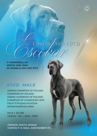 ![]() | ESCOBAR CASA DI AMICI HORVENDILLUS ARGOS VON TARA x HAJMA-D JAG-SZA CH Poland, Jr CH Poland, HD-A/A, ED-0/0, Cardio: OK | 19.02.2017 Male Blue |