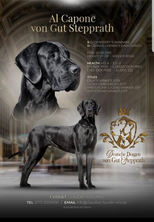 ![]() | AL CAPONE VON GUT STEPPRATH, ATC AV00773DEU VDH/DDC129638 GRANDE GREMIN'S DARK DARGO x ELDERBERRY'S WANNABE HD-A, ED-0 | 04.08.2016 Male Black |