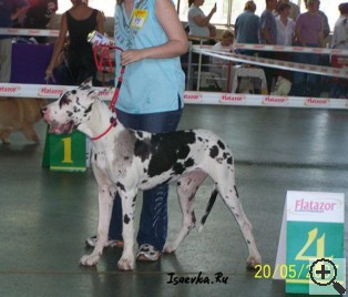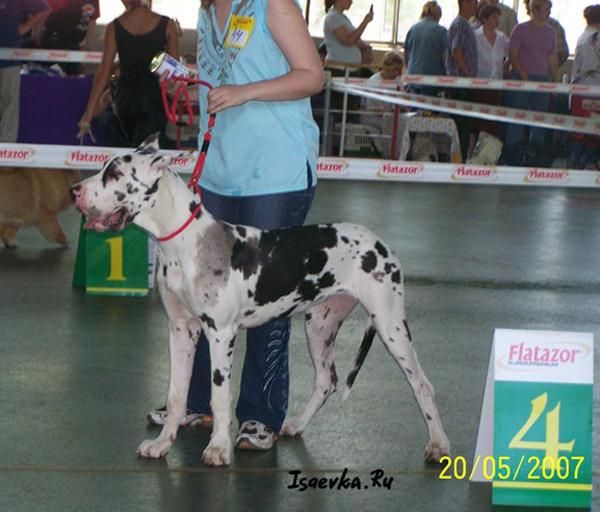 | Дата проведения | Название | Город / Страна | Класс | Число собак в классе | Число собак на выставке (того же пола/всего) | | Статус | Результат | | Эксперт | | 20.05.2007 | 'Немецкий Дог-2007', монопородная, Москва