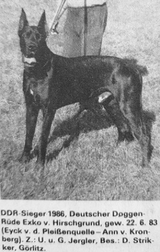 ![]() | EYKO VOM HIRSCHGRUND, DDR 12059 EYCK VON DER PLEIßENQUELLE x ANN VOM KRONBERG | (†) 22.06.1983 Кобель Черный |