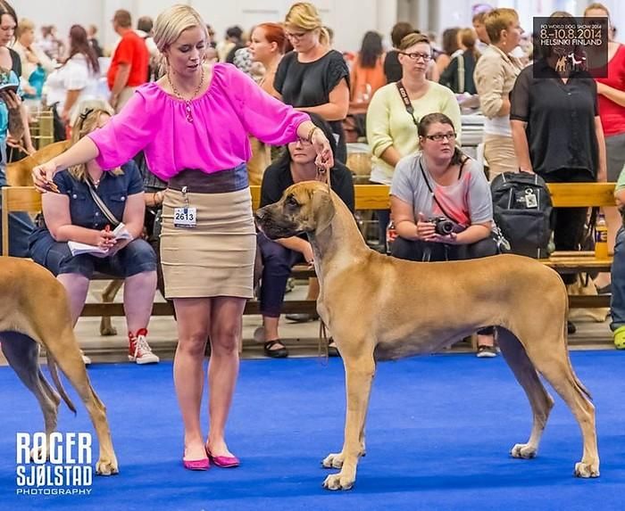 | Date of show | Show name | City / Country | Class | Number of dogs in class | Number of dogs on the show (same sex/all) | | Status | Result | | Judge | | 08.08.2014 | World Dog Show-2014 fawn, brindle females | Finland | Junior | 12 | 43 / 43 | | International | 004, ex.