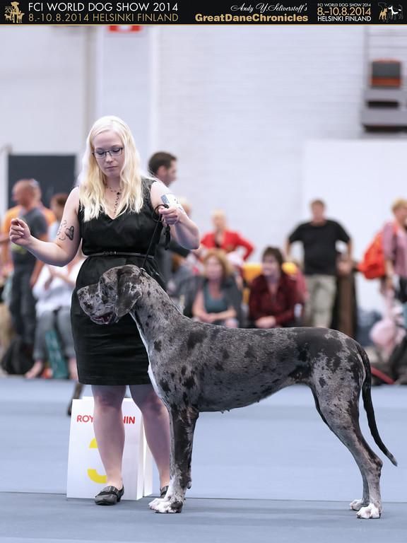 | Дата проведения | Название | Город / Страна | Класс | Число собак в классе | Число собак на выставке (того же пола/всего) | | Статус | Результат | | Эксперт | | 08.08.2014 | World Dog Show-2014, черно-мраморные