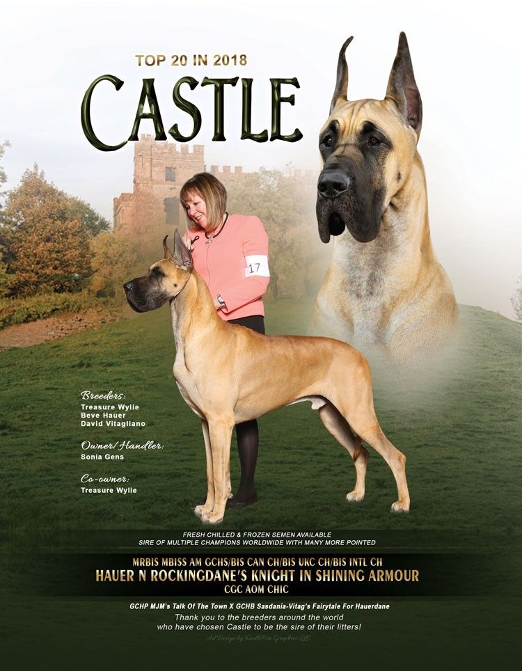 Multiple Reserve BIS, Multiple Best in Speciality Show, American Grand Champion Silver, BIS Canadian Champion, BIS United Kennel Club Champion, BIS International Kennel Club Champion, Canine Good Citizen, Award of Merit Great Dane Club of America, Top 20 in 2018